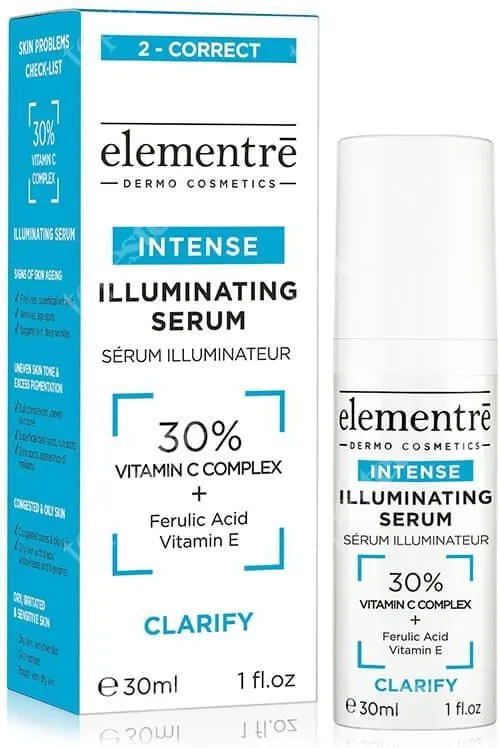 Elementre Illuminating Serum er et intensivt og avansert C-vitaminserum som kombinerer L-askorbinsyre, C-vitaminestere og ascorbosilan for å virke både i dypet og på hudoverflaten. Serumet inneholder ferulinsyre og vitamin E som stabiliserer C-vitamin og gir antioksidantbeskyttelse mot miljøpåvirkninger.